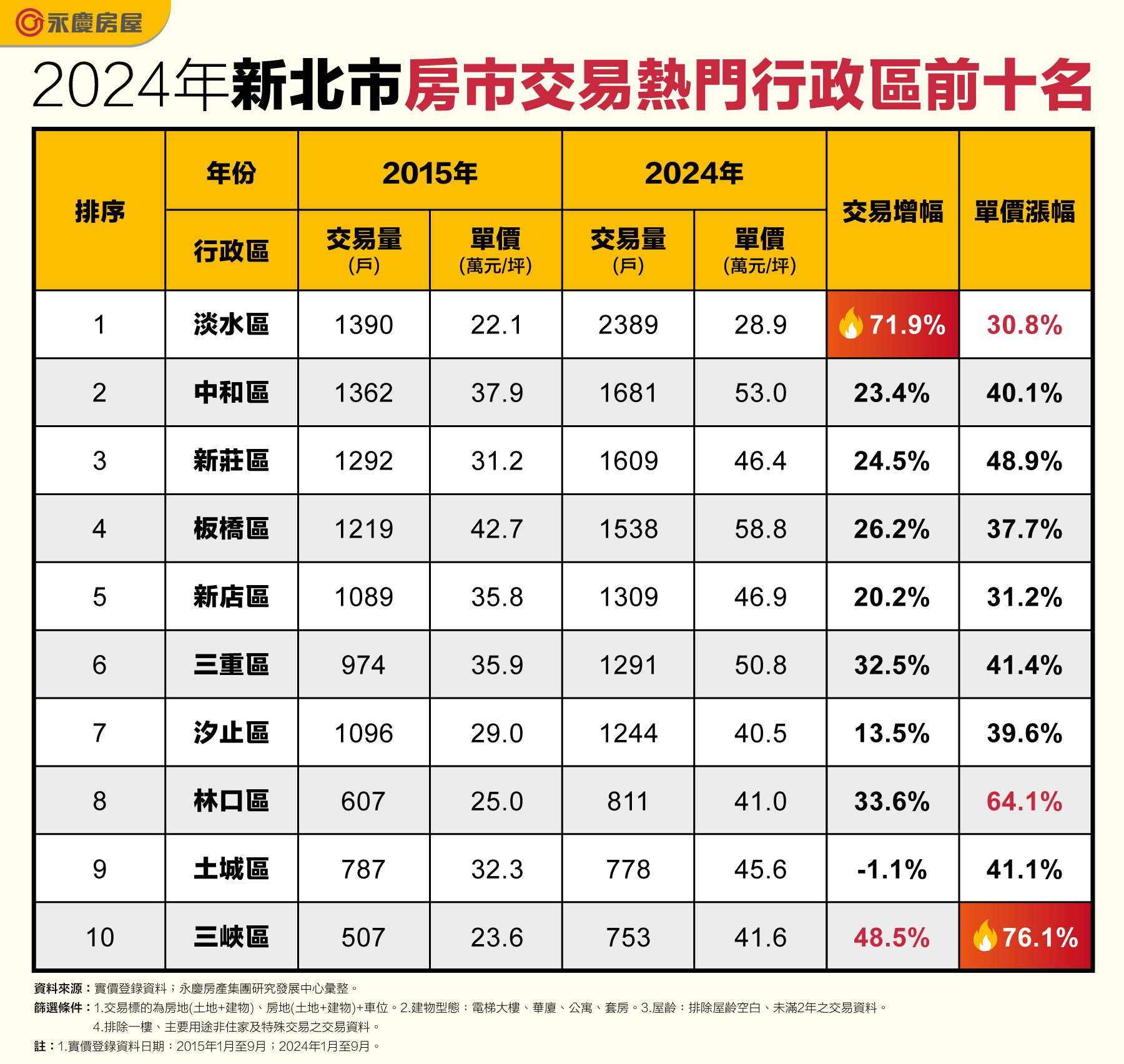新北市不僅幅員廣闊,人口數也是全台最多,根據新北市政府民政局統計,新北市人口超過4百萬,居住需求強勁。永慶房產集團統計2024年1至9月新北市住宅交易量前十名行政區,近十年的價量變化,其中淡水區交易量增加逾七成,位居榜單第一;而三峽區不僅交易量有48.5%的增幅,房價漲幅亦逾七成,房市價量雙漲表現亮眼。