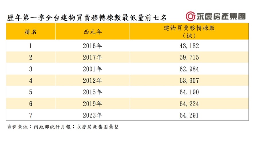▲歷年第一季全台建物買賣移轉棟數最低量前七名。(圖/永慶房屋提供)