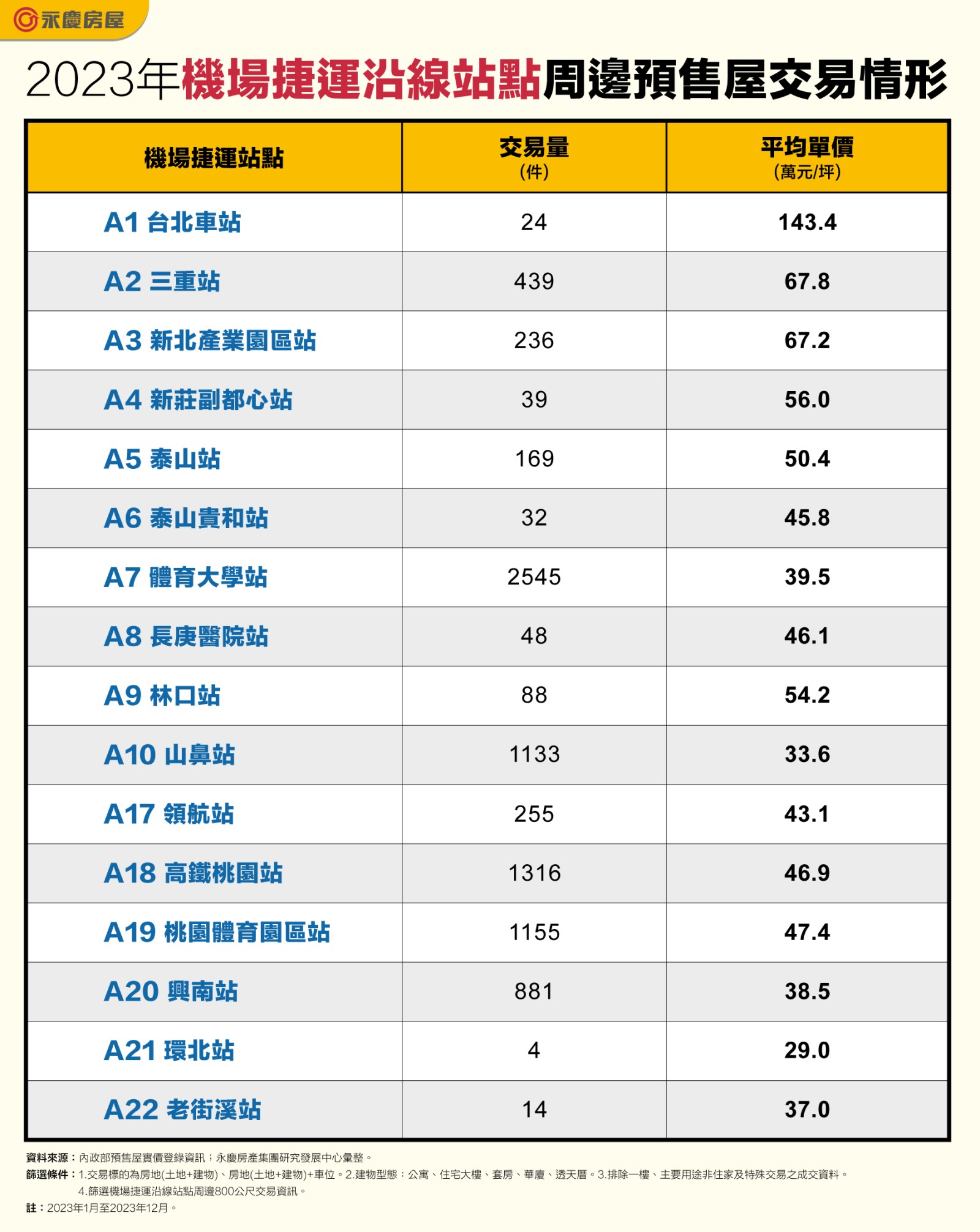 機場捷運自2007年3月2日正式營運通車即將滿七年,帶動各個捷運站點周遭房市的發展。永慶房產集團彙整機場捷運2023年各站點周邊800公尺內預售屋實價登錄資訊,其中有四個捷運站點2023年周邊預售屋交易量突破千件。