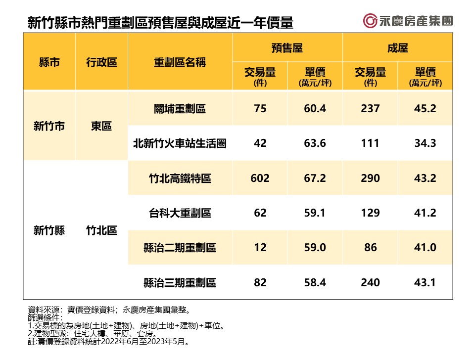 至於預售屋交易部分。陳金萍表示,不論是東區的關埔重劃區或是竹北高鐵特區、縣治二、三期重劃區等,近一年預售屋住宅單價均已「坐5奔6」甚至是「坐6奔7」,其中以竹北高鐵特區房價最高,因擁有高鐵站前交通優勢,加上科技總部、大型開發案陸續展開,讓竹北高鐵特區房市後市可期,近一年預售屋交易量602件,交易熱絡,住宅單價67.2萬元,其中,預售案「惠宇謙恆」、「寶佳奇磊」與「豐邑之森」,目前成交價均已站穩7字頭,直追新北市蛋黃區。