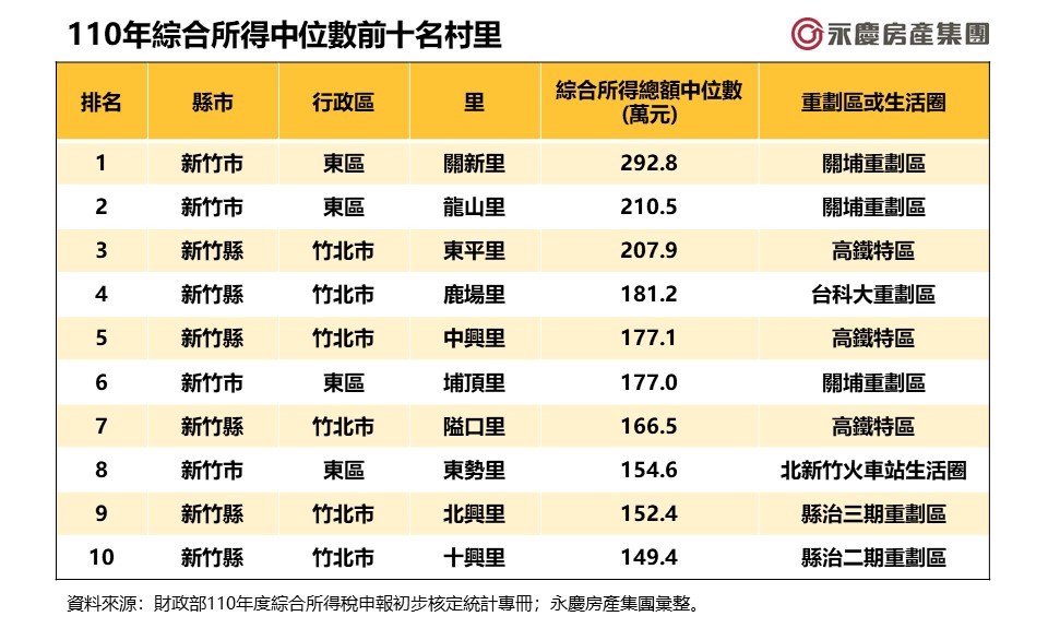 根據財政部公布「110年度綜合所得稅申報初步核定統計專冊」,全國「最富里」依然由新竹市東區關新里綜合所得總額中位數292.8萬元拿下,傲視全國:其次則是同樣在東區的龍山里,綜合所得總額中位數210.5萬元,而新竹縣竹北市東平里則以207.9萬元位居第三,前三名綜合所得中位數均突破200萬元大關。