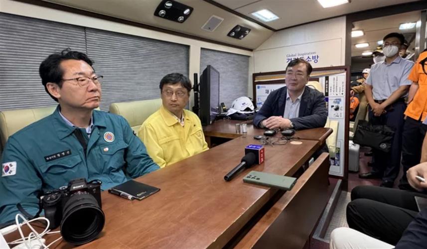 24日深夜,韓國京畿道行政第二副知事吳厚錫、華城市市長鄭明根和消防部門官員等向趕赴華城電池工廠火災現場的中國駐韓國大使邢海明(左三)介紹事故情況和搜救進展。