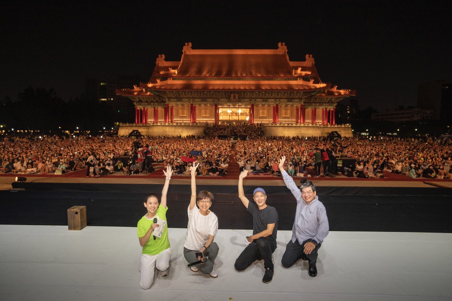 ▲雲門舞集戶外公演,主持人曾寶儀、國家兩廳院藝術總監劉怡汝、雲門藝術總監鄭宗龍、國泰金控總經理李長庚。(圖/雲門舞集提供)