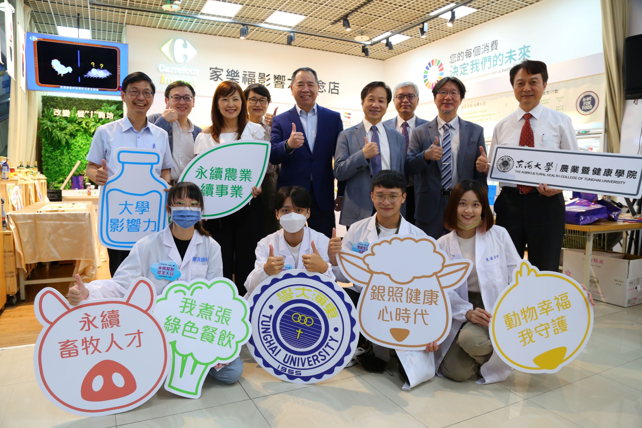 東海大學與家樂福攜手合作簽署的「永續農業與健康人才培育合作備忘錄」,合作內容包含推動永續農業與健康人才培育、共同推動動物福利、產學雙方定期互訪進行技術交流學習、拓展產業合作研究計畫、合辦產業研討會及相關技術交流座談會。今日下午在台中家樂福西屯店舉辦的記者會中,包括東海大學校長張國恩、副校長張嘉修及家樂福總經理王俊超、永續長蘇小真、農委會企劃處兼淨零辦公室執行長莊老達、台灣動物社會研究會副執行長陳玉敏、好食機創辦人謝昇佑、104人力銀行顧客價值經營處協理翁維薇等人,都共同出席關心永續人才的未來發展。