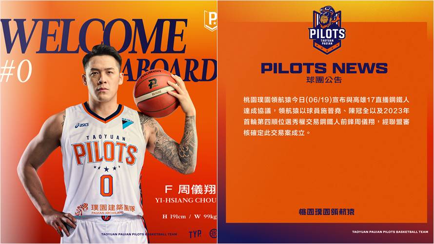 桃園璞園領航猿今(19)日宣布與高雄17直播鋼鐵人雙方達成協議,領航猿以球員施晉堯、陳冠全及2023年首輪第四順位選秀權,交易鋼鐵人前鋒周儀翔,經聯盟審核確定此案成立。