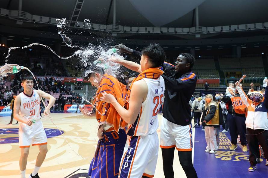 ▲賽後享受「礦泉水浴」慶賀的盧峻翔,開心感謝教練與隊友讓他持續保持信心,才能勇敢出手完成這場比賽。(圖/領航猿提供)