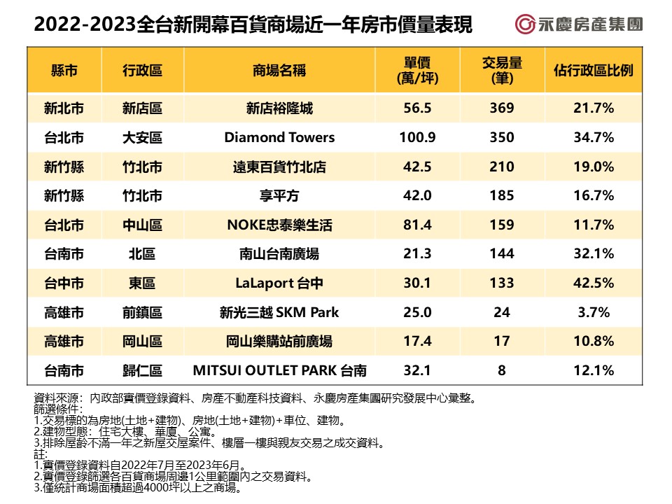 ▲永慶房產集團統計近二年全台新開幕或即將開幕的百貨商場周邊交易價量市況,新店裕隆城交易最火熱,平均天天有成交!(圖/永慶房屋提供)