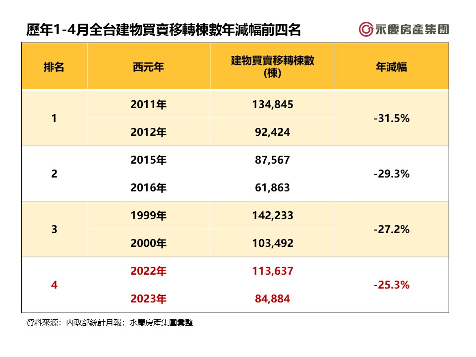 進一步觀察歷年1-4月房市交易量表現,陳金萍說明,自1999年以來共出現五次量縮幅度超過二成的紀錄,分別是2000年受到網路泡沫衝擊,較1999年同期減27.2%,以及2009年金融海嘯,年減23.8%、2012年因奢侈稅上路與選戰緊繃的總統大選影響,交易量較前一年同期減31.5%,以及2016年房地合一上路讓交易量年減29.4%,再來就是今年明顯量縮25.3%,年減幅創下史上第四大。若觀察實際交易量表現,今年1-4月交易量為84,884萬棟,僅高於2016年61,863棟、2017年的79,557棟,2023年1-4月全台建物買賣移轉棟數創下史上第三低量。