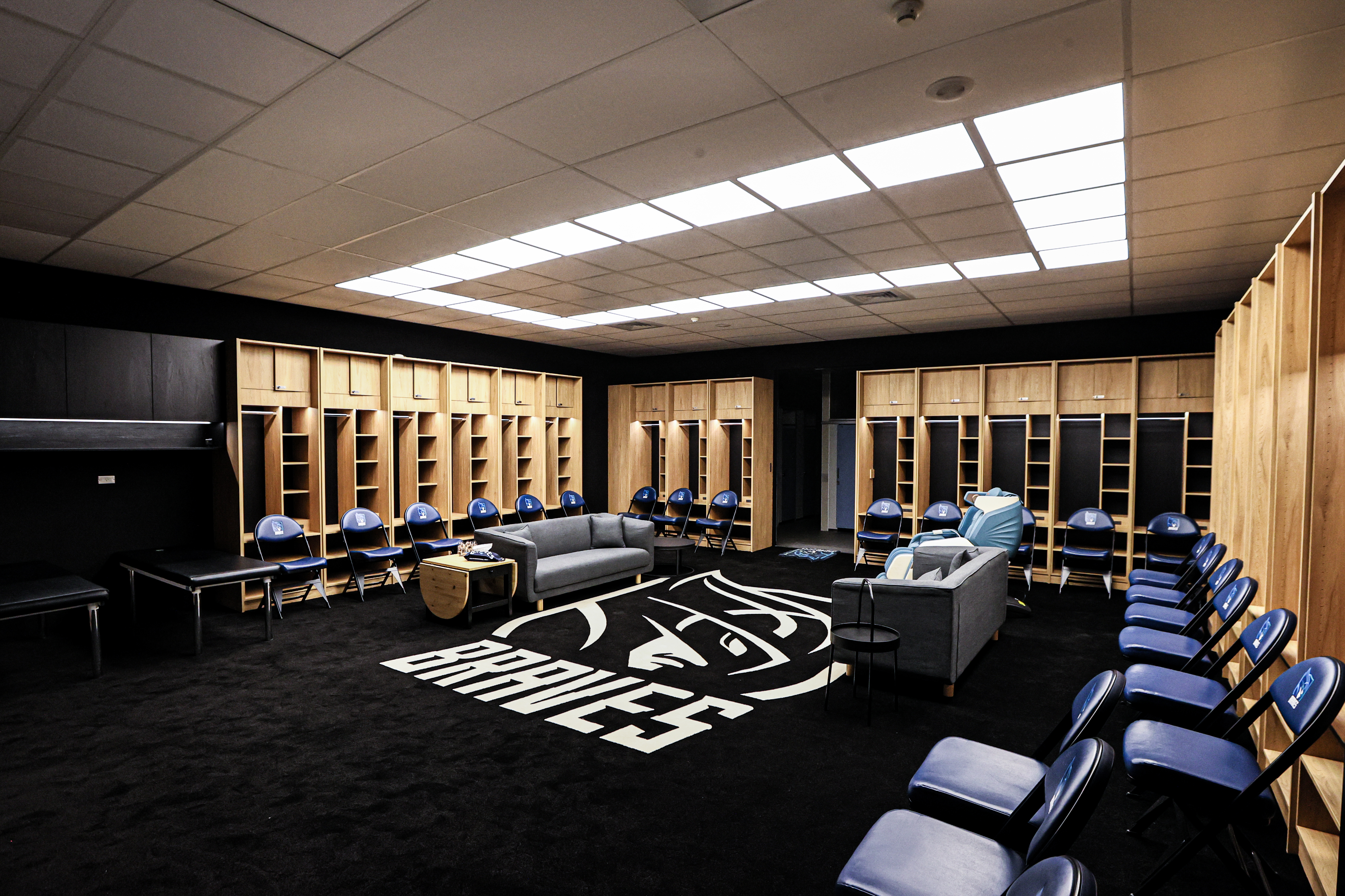 勇士球員休息室規劃設計為:防護區、球員及教練置物櫃、沙發休憩區,並優化硬體設備。整體空間以沉穩的黑色調及橡木材做搭配,呈現簡約俐落的空間概念。置物櫃以ㄇ字型對稱排列,每座櫃體皆擁有獨立照明和插座。全室燈具皆更換為LED光板燈優化室內照明及氛圍,並提供多段式照明功能。訂製的黑色地毯搭配比爾隊徽,燈光集中照射展現勇士剛強的氣勢。休憩區的沙發、茶几、圓桌及按摩椅,不管是後衛還是210公分的中鋒,皆能舒適得享受放鬆。身為陣中隊魂的「野獸」林志傑第一次踏進升級的休息室說:「終於有像回家的感覺!」而總教練許晉哲也表示:「很感動,一切都很棒!」