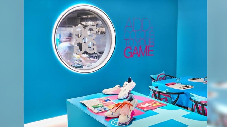 今年夏天G/FORE與chinois聯手打造期間限定的用餐環境及菜單,將雙品牌想傳遞的理念隱藏在每一個細節之中,讓消費者透過各種感官體驗,深刻感受「顛覆傳統」的品牌精神,期間限定的全新裝潢色彩絢爛,處處可見搶眼的水藍色搭配桃紅色,高飽和度的色彩創造視覺上的衝擊,更大膽將餐廳中島打造成一個巨大的G/FORE鞋盒,同時牆面上的新品主視覺也充分展露出G/FORE繽紛熱情的美式風格,顛覆大眾對高爾夫服飾及中式料理的想像!