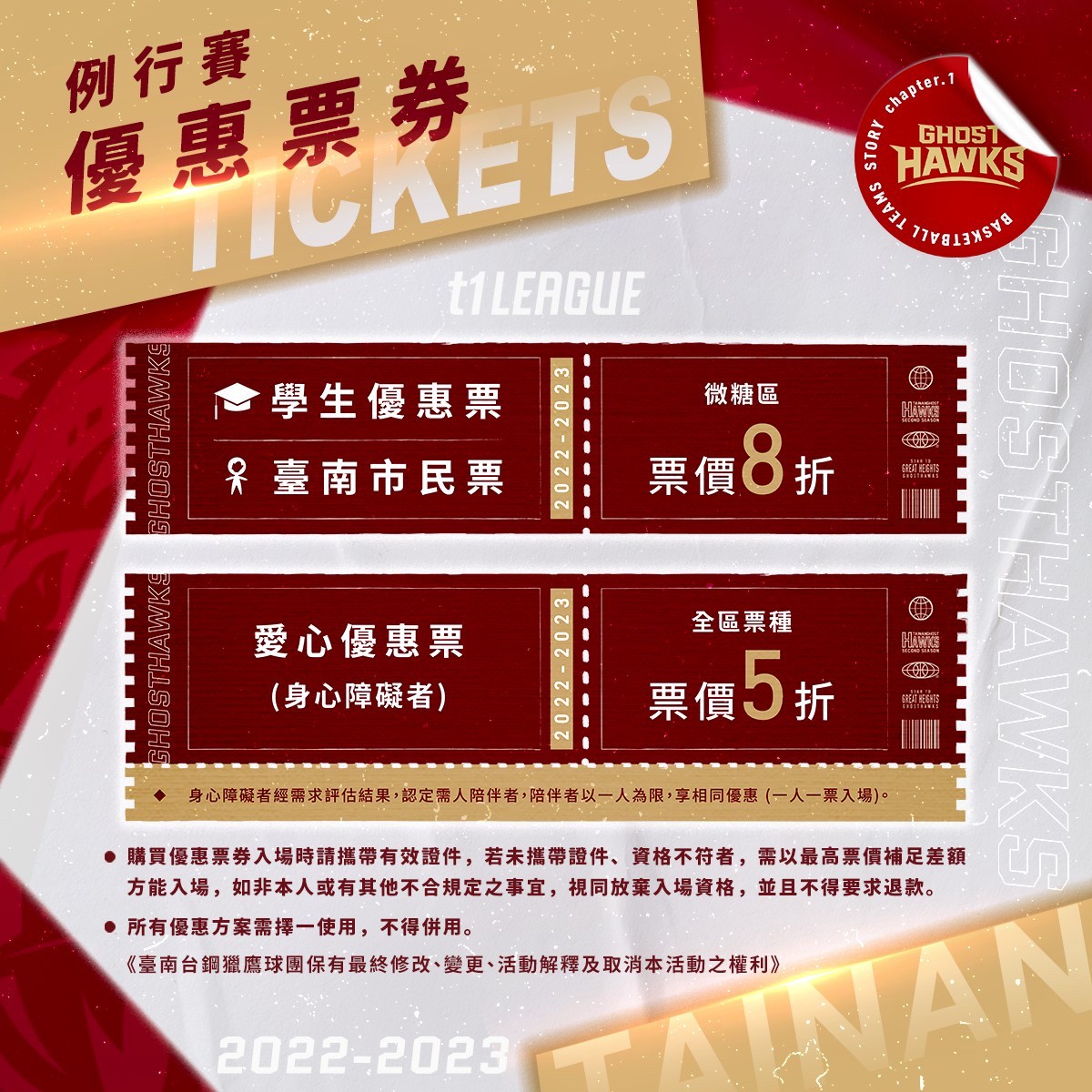 迎接新賽季來臨,台鋼獵鷹主場季票於日前已開放劃位,第二階段2022-23年賽季15場主場例行賽單場門票及燦星旅遊套票,則於10/25(二)12:00全面開放劃位,為回饋臺南鄉親,臺南市民可享8折優惠,此方案亦優惠於學生族群,另外還有愛心優惠票全區票價5折;台鋼獵鷹與燦星旅遊聯合首推,只要購買主場例行賽單場次門票,加購高鐵相關商品享優惠及免費定點接駁,再加碼送「台鋼獵鷹聯盟x臺南特產上智關廟麵」乙盒,歡迎獵鷹最重要的最佳第六人,一起來獵鷹主場翱向勝利,台鋼獵鷹年度門票皆可於「FamiTicket全網購票系統」購買,燦星旅遊套票則於燦星旅遊網獨家販售,更多詳細購票資訊及最新票務活動敬請參考臺南台鋼獵鷹官方粉絲專頁公告。