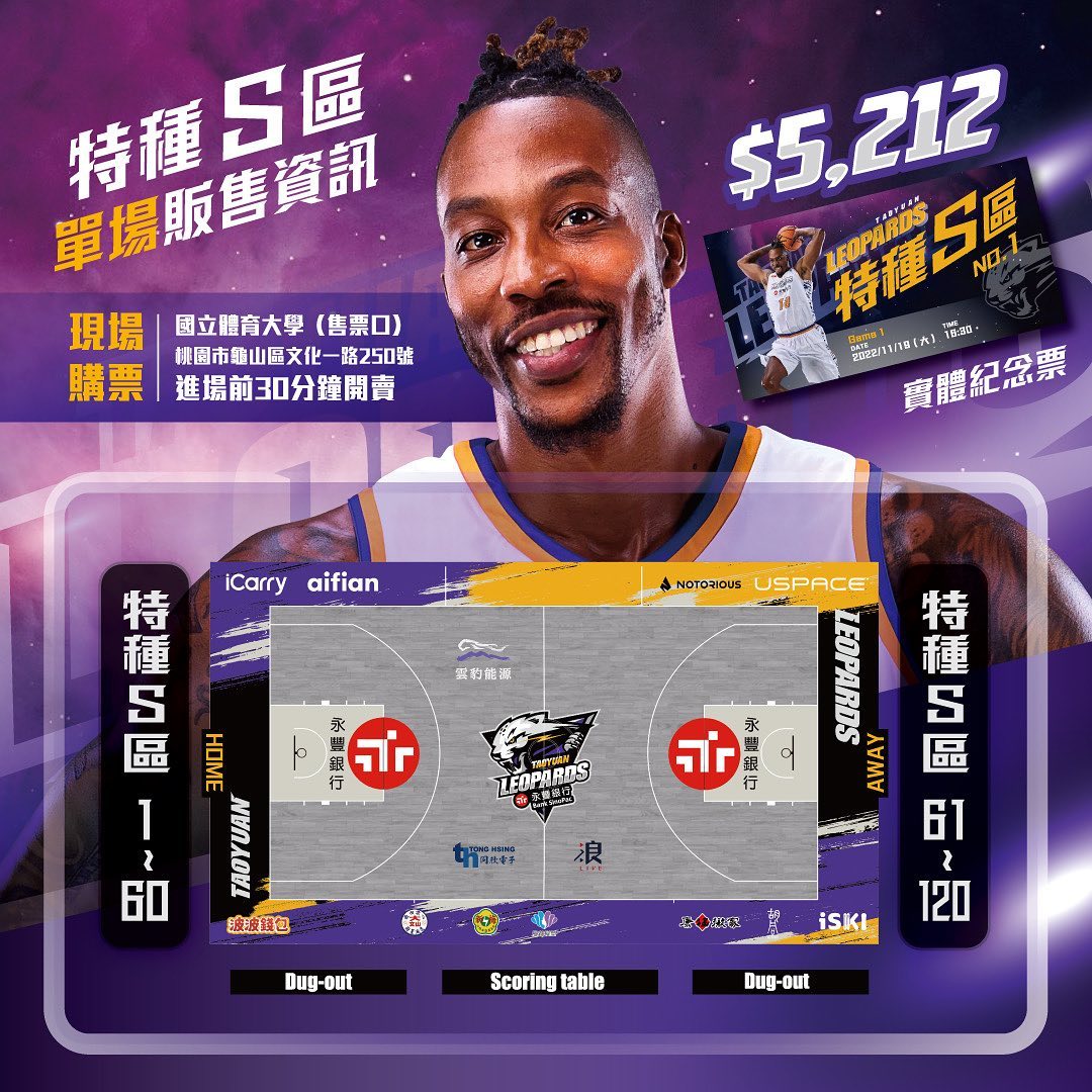 NBA巨星「魔獸」霍華德(Dwight Howard)加入台灣T1聯盟,桃園雲豹隊後將於本週六(19日),迎接加盟後的首戰。雲豹球團在4場主場門票瞬間售鑿後,就表示將開賣球場第一排,17日晚間特別宣布加開「特種S區」GOLDEN SEAT季票,凡是購買季票的觀眾,除了享有15場主場賽事皆可享受尊榮級觀賽體驗外,還能獲得一張由霍華德親筆簽名的場邊椅,而價格公開也讓人十分驚訝,要價16萬8000元,恐是台灣籃壇門票最高價。