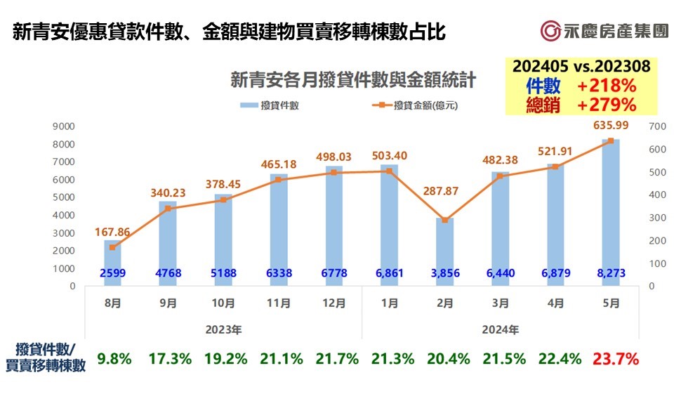 挑戰11年新高! 2024年估34.8-36.0萬棟之間 年增13%至17% 六成消費者看漲房價! 看漲比例創近9季新高 新青安貸款上路近一年! 七大都會區會加快購屋皆逾五成 新青安引爆房市買氣! 五大行庫新青安房貸占比逾四成