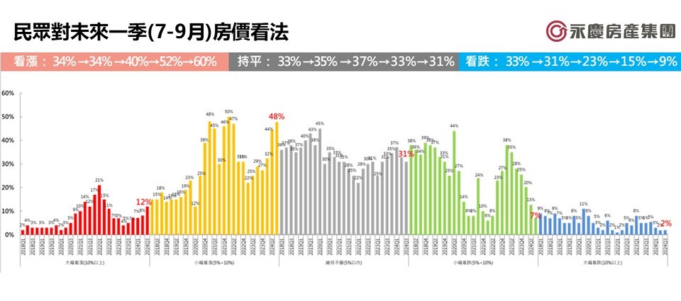 根據永慶房屋2024第三季網路會員調查,全台認為房價看漲比例增加8個百分點至60%,六成消費者看漲房價,創近9季以來新高,而看跌降至9% (圖一),連六季下降。永慶房屋業管部協理陳賜傑指出,全球經濟持續復甦,台灣景氣也亮出黃紅燈,加上台股持續刷新歷史新高,消費信心穩定回升,同時在通膨仍無顯著下降的情況下,讓消費者更加深房價上漲預期,消費者看漲房價比例較上季又持續增加。