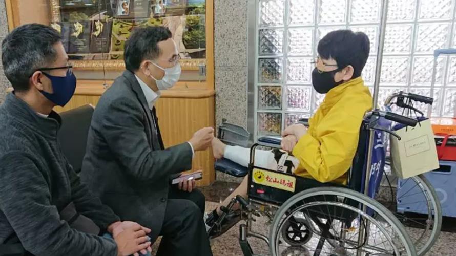 周思潔日前不慎跌傷,台中市都發局副局長曾文誠和建設局主秘許獻鍾昨前去探視。(圖/中市府提供)