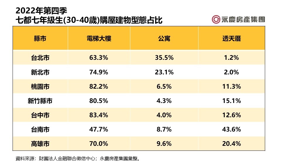 不過,陳金萍補充,我們可以發現雙北以外都會區公寓占比均不到一成,但反觀雙北市的公寓購屋占比卻逾二成,台北市更高達35.5%,顯示在高房價的排擠效應下,不少七年級生在買得起的總價條件,退而求其次,選擇優質地段、具保值性的公寓產品。此外,台南市的七年級生在電梯大樓與透天厝各有約一半的擁護者,透天厝在台南市仍有高人氣,有天有地、居住空間大的透天厝對於七年級生仍有吸引力。