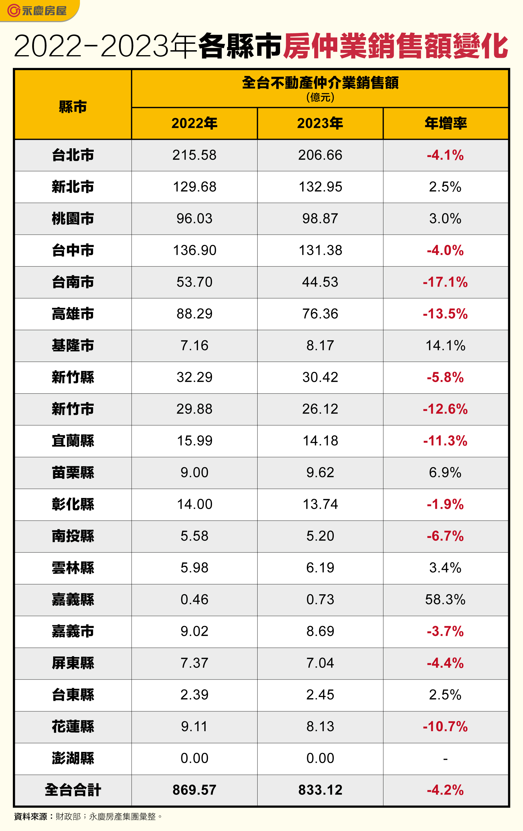 永慶房屋根據財政部統計發現,2023年全台房仲業銷售額達833.12億元,年減4.2%,雖呈現連兩年衰退,但自2021年起,已連續三年突破800億元大關,顯示房市買氣仍穩健。