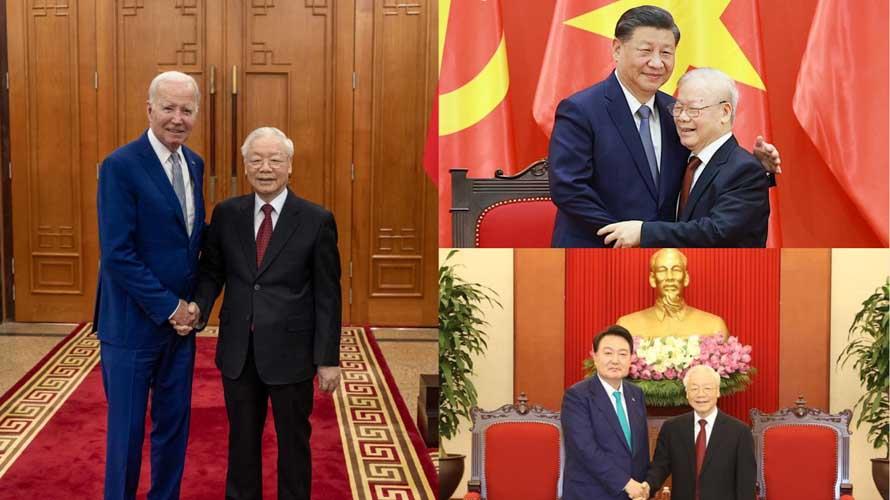 越共中央總書記阮富仲今年陸續會見美國總統拜登(左照左邊)、中國國家主席習近平(右上照左邊)、韓國總統尹錫悅(右下照左邊)。合成照片取自@WhiteHouse、@dbndtv「X」社群平台