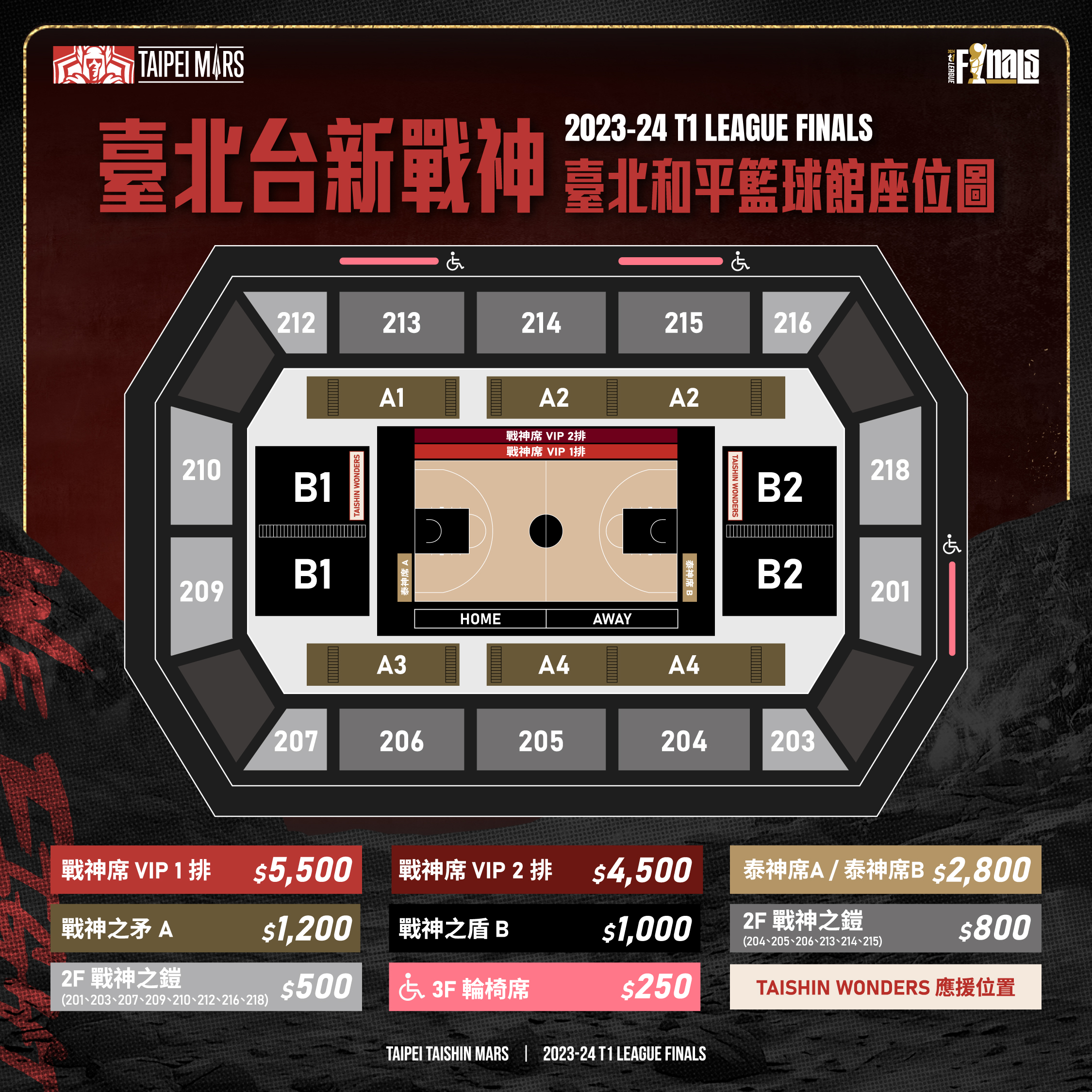 ▲臺北台新戰神總冠軍賽主場將於臺北和平籃球館舉行,票價與座位如圖。(圖/臺北戰神提供)