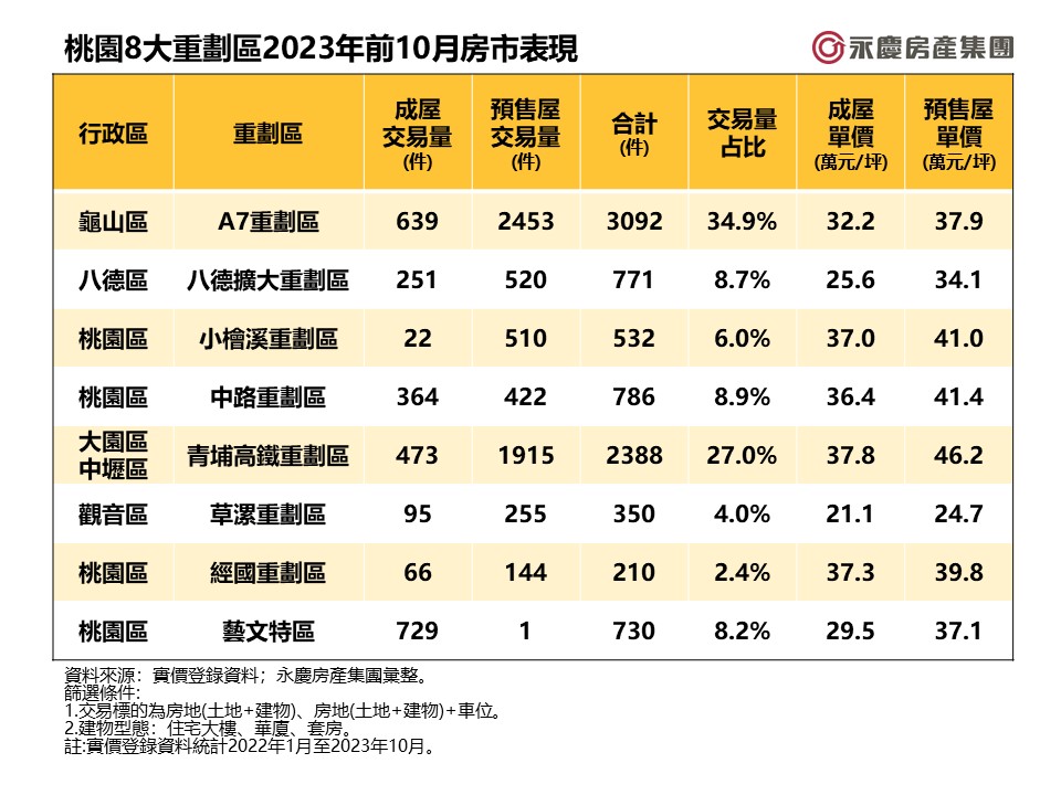 雙北房價居高不下,再加上北北桃交通網絡建構日趨完善,使得桃園房市備受矚目,其中市內的8大重劃區,更成為桃園房市的焦點。永慶房產集團彙整桃園A7重劃區、八德擴大重劃區、青埔高鐵重劃區等共計8處重劃區的房市表現。位於龜山的A7重劃區,今年前10月交易量便高達3092棟,平均每天都能交易10棟,交易表現最為亮眼!至於桃園草漯重劃區還有2字頭房價,最為實惠。