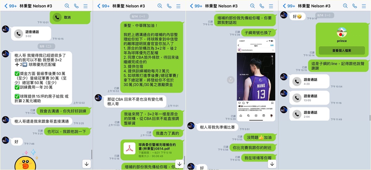 從張樹人回復訊息可以看到,大部分的合約需求都有達到,但打進季後賽的獎金從50萬降到30萬,冠軍也是30萬,另外從CBA回來後不能直接調整薪資。截圖內容也提到,林秉聖在打瓊斯盃時曾和張樹人見面,球員王子綱也將背號3號讓給他,自己變成13號,張樹人還要林秉聖打電話給王子綱道謝。