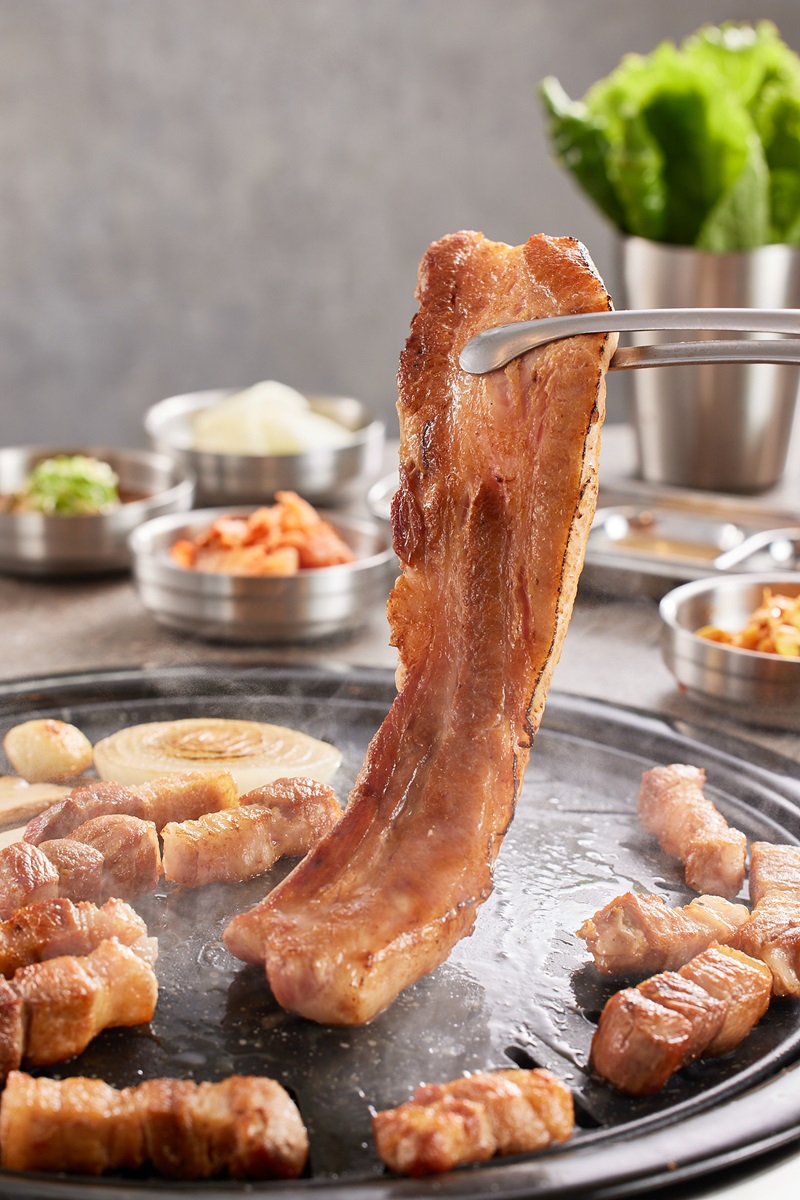「金咕韓式原塊烤肉」保留韓式烤肉道地餐點、口味和吃法,更使用原塊厚切的「國產豬五花三吃」為主打菜色。第一吃「黃金鑄鐵燒」,採用韓國進口鑄鐵壓肉板,將厚實的豬五花肉逼出多餘油脂,使肉質擁有金黃色外衣和酥脆口感,也是唯一使用韓國鑄鐵壓肉板的韓式烤肉餐廳。第二吃「罪惡濃起司」,以莫札瑞拉起司包覆豬五花,感受肉汁與奶香在口中迸發的超罪惡組合。第三吃「爆炒醬羅勒」,將羅勒與秘製韓醬爆炒豬五花,香氣撲鼻最具特色。雙人套餐988元起(不含10%服務費),由專人全程代烤,讓消費者開心聚餐、輕鬆吃烤肉!
