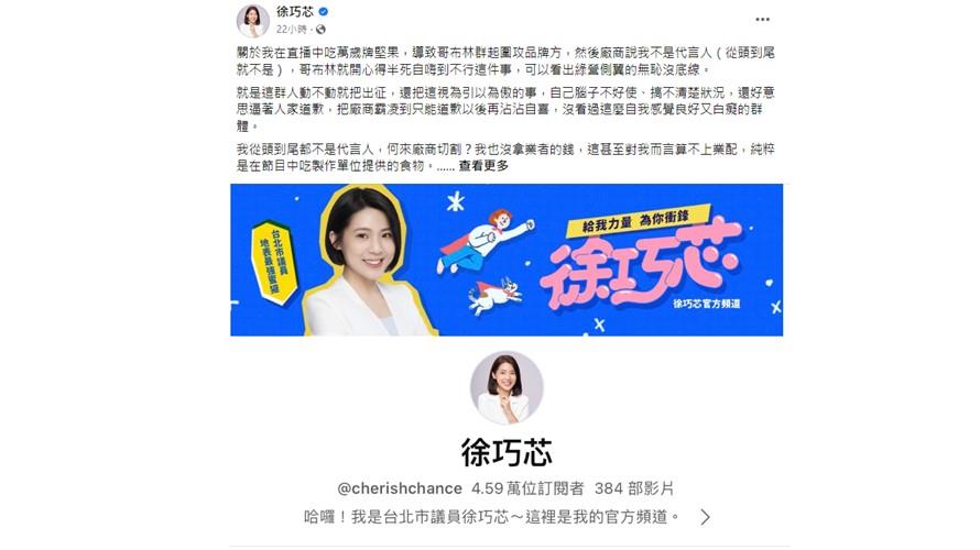 徐巧芯在臉書發文表示,綠營側翼的攻擊毫無底線,他們不顧事實,還迫使人道歉,然後沾沾自喜,這種自我感覺良好又愚蠢的群體令人啼笑皆非。她再次強調自己從頭到尾都沒有代言,更沒有收取業者的報酬,完全是單純地在節目中品嘗食物。