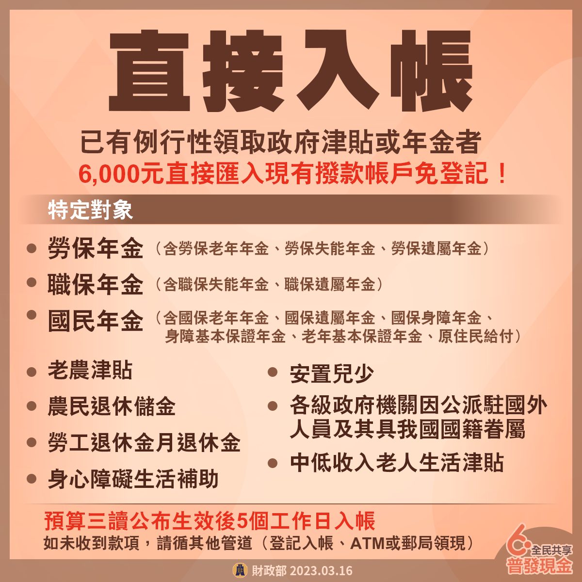 普發現金公布有5種方式可領取,包含「登記入帳」、「ATM領現」、「郵局領現」、「直接入帳」及「造冊發放」等,其中「登記入帳」將會在22日開放,選擇此種方式的民眾,需至「6000.gov.tw」官網進行線上登記,完成程序並經系統核驗登記資料無誤後,6000元即會匯入指定帳戶。