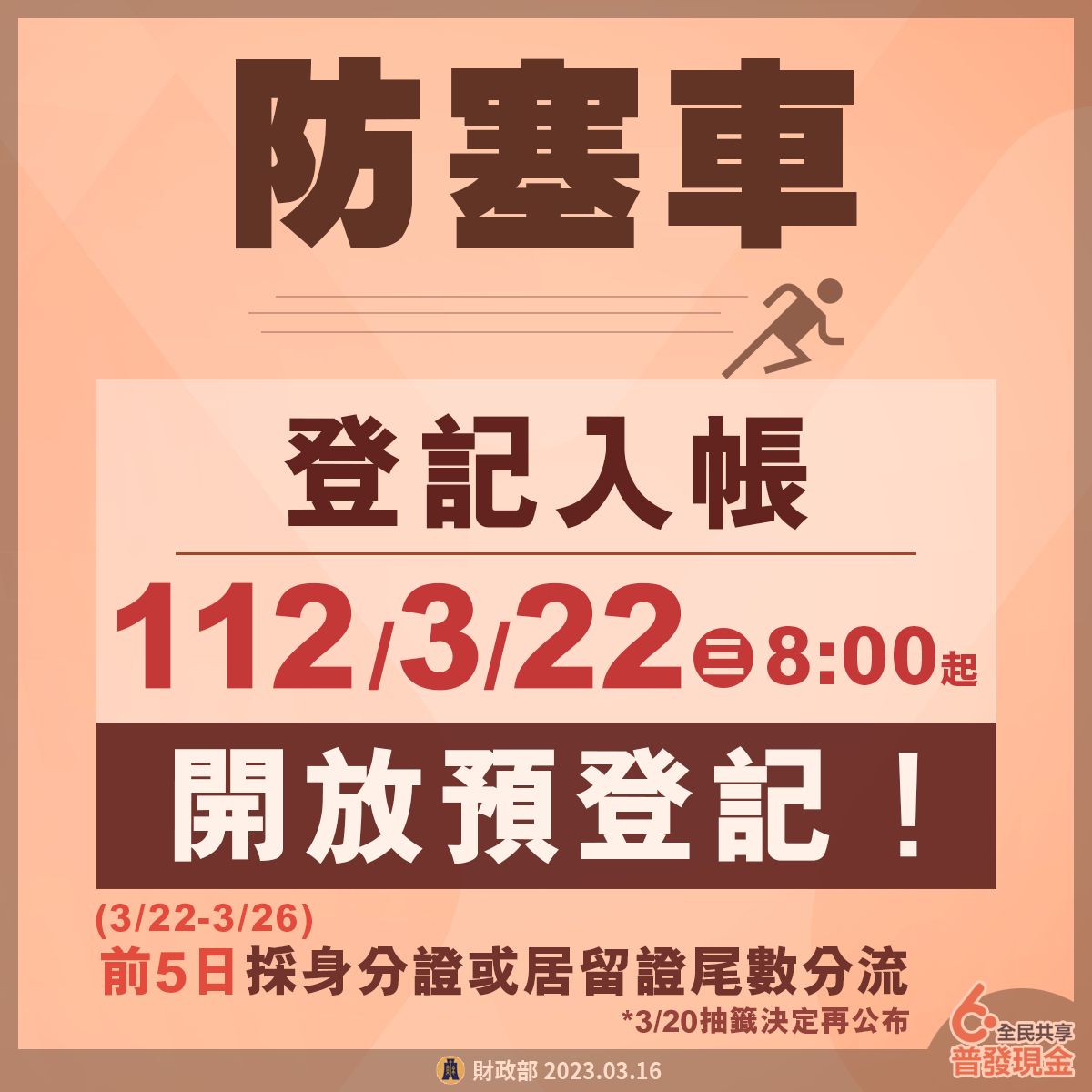 普發6000元現金今(16)日行政院宣布,3月22日起開放登記,並表示將會用身分證字號尾數分流,但具體辦法將在20日記者會公布,不過不少網友對先前五倍劵時網站大當機仍心有餘悸,認為這次一定仍大多數都選擇網站申請,但時候五倍劵當機恐重演。