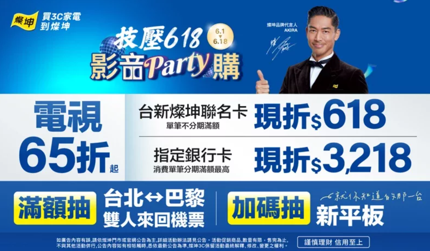 為迎接年中最大促銷檔618購物節和Computex大展,燦坤「618 AI購物節」自6月1日至6月18日開跑,單筆消費滿618元,筆筆加碼抽新上市平板;電視強打58折起,指定機型送Dyson吹風機、SONY耳機;燦坤電競月、線上電腦展同時開跑,搶攻AI PC換機潮。夢幻巴黎奧運倒數,6月期間全館消費滿501元抽「台北-巴黎雙人來回機票」。