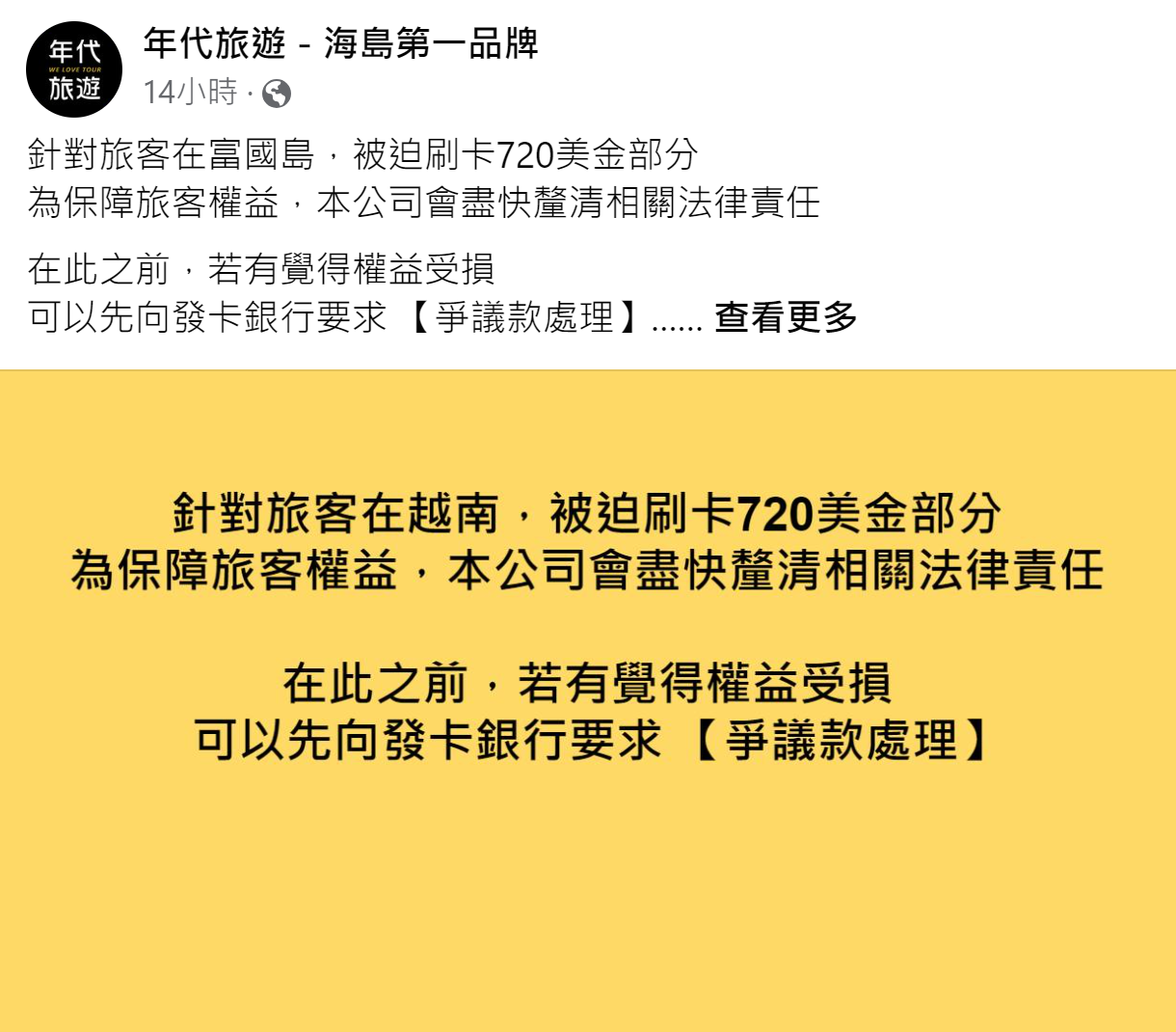 近300名春節在越南富國島旅遊的台灣旅客遭遇丟包,因為組團社年代旅遊(美加國際旅行社)與越南地接社的款項問題,導致上百名旅客在富國島遭遇此窘境,引發了爭議。針對旅客被迫刷卡支付720美元的部分,年代旅遊在其臉書粉專昨晚發文表示,在釐清法律責任之前,受損的團員若感到權益受損,可以向發卡銀行要求「爭議款處理」。這番說法卻引起網友的不滿。