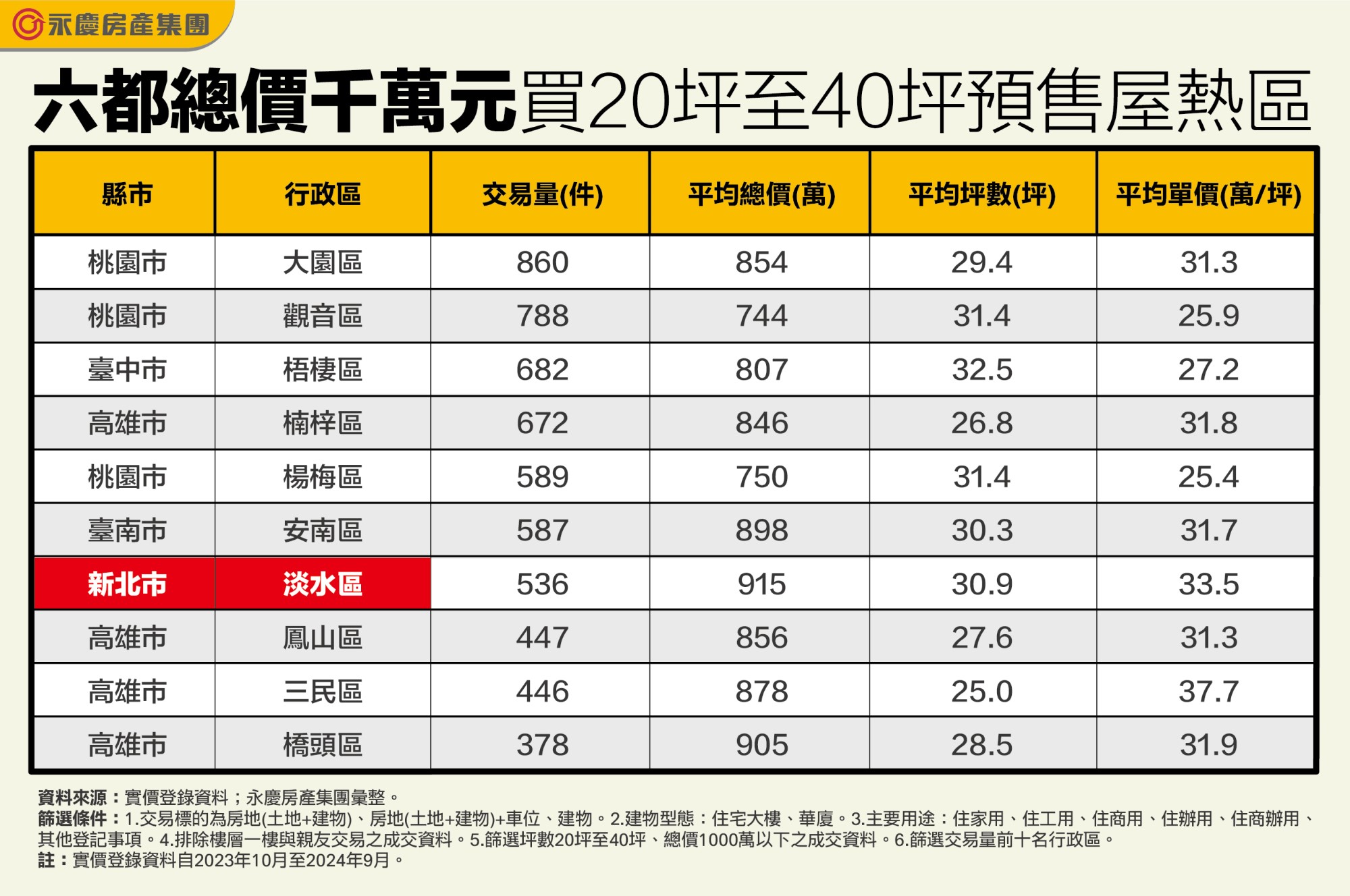 想要在六都中以千萬預算入手2至3房的預售大樓,民眾恐怕只能將目光轉往蛋白區才有機會。永慶房產集團盤點六都坪數20坪至40坪、總價千萬內的預售屋交易量前十名行政區。雙北僅剩淡水最有機會,台中、桃園、台南都需要到蛋白區尋覓,高雄則還有市中心可選。