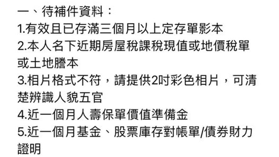 原PO在臉書社團「Costco好市多 商品經驗老實說」發文抱怨,問其他會員需要補這麼多文件嗎?她好奇是個人問題還是大家都一樣,從原PO的貼文照片,待補資料包含有效且存滿三個月以上定存單影本、本人名下近期房屋稅課稅現值或地價稅單或土地謄本、2吋彩色相片、近一個月人壽保單價值準備金、近一個月基金、股票庫存對帳單或債券財力證明、近三個月活存明細。