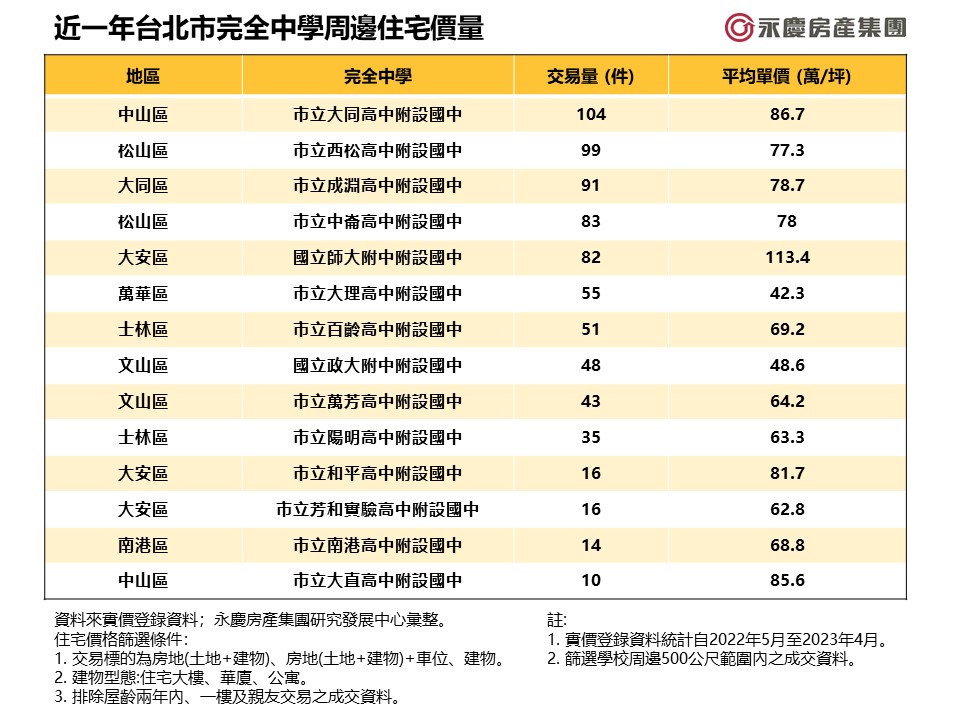 近年來,許多父母為了減輕孩子的升學壓力,因此選擇能直接從國中直升高中的「完全中學」,也帶動完全中學周遭房市的熱絡。永慶房產集團彙總14所台北市市立完全中學近一年的房市價量狀況,發現大同高中附中交易最火熱、大理高中附中和政大附中周遭仍有4字頭房價。