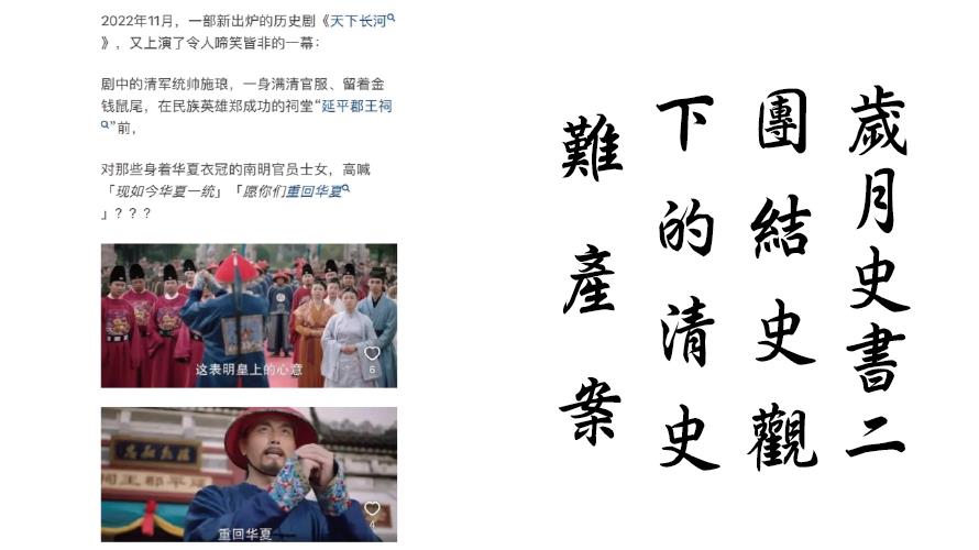 2022年11月,一部新出的歷史劇《天下長河》,拍到康熙時期攻打台灣的主帥施琅,穿著一身滿清官服,留著辮子,到了台南我們府城的延平郡王祠,對著一群穿著華夏衣冠,明朝服裝的南明官員及男女百姓,高喊「現如今華夏一統」、「願你們重回華夏」。