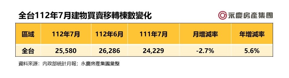 根據內政部最新資料顯示,7月全台建物買賣移轉棟數為25,580棟,月減2.7%,永慶房屋研展中心副理陳金萍說明,7月的建物買賣移轉棟數反映的是6月至7月初的市況,房市回歸供需基本面,因民眾對於通膨常態化的預期,購屋意願仍高,但期待價格有修正空間,但屋主讓價意願低,買賣雙方價格認知仍有部分落差,房市買氣與6月差距不大,全台7月建物買賣移轉量較6月略減2.7%。