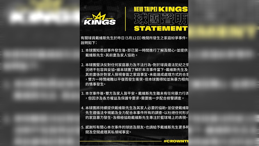 新北國王歸化球員戴維斯昨(12日)晚和前妻在警局前拉扯,因前妻持有家暴保護令,因此警方當場將戴維斯逮捕,並在稍早以10萬元交保,稍早新北國王籃球隊針對有關球員戴維斯家庭紛爭事件發出聲明。