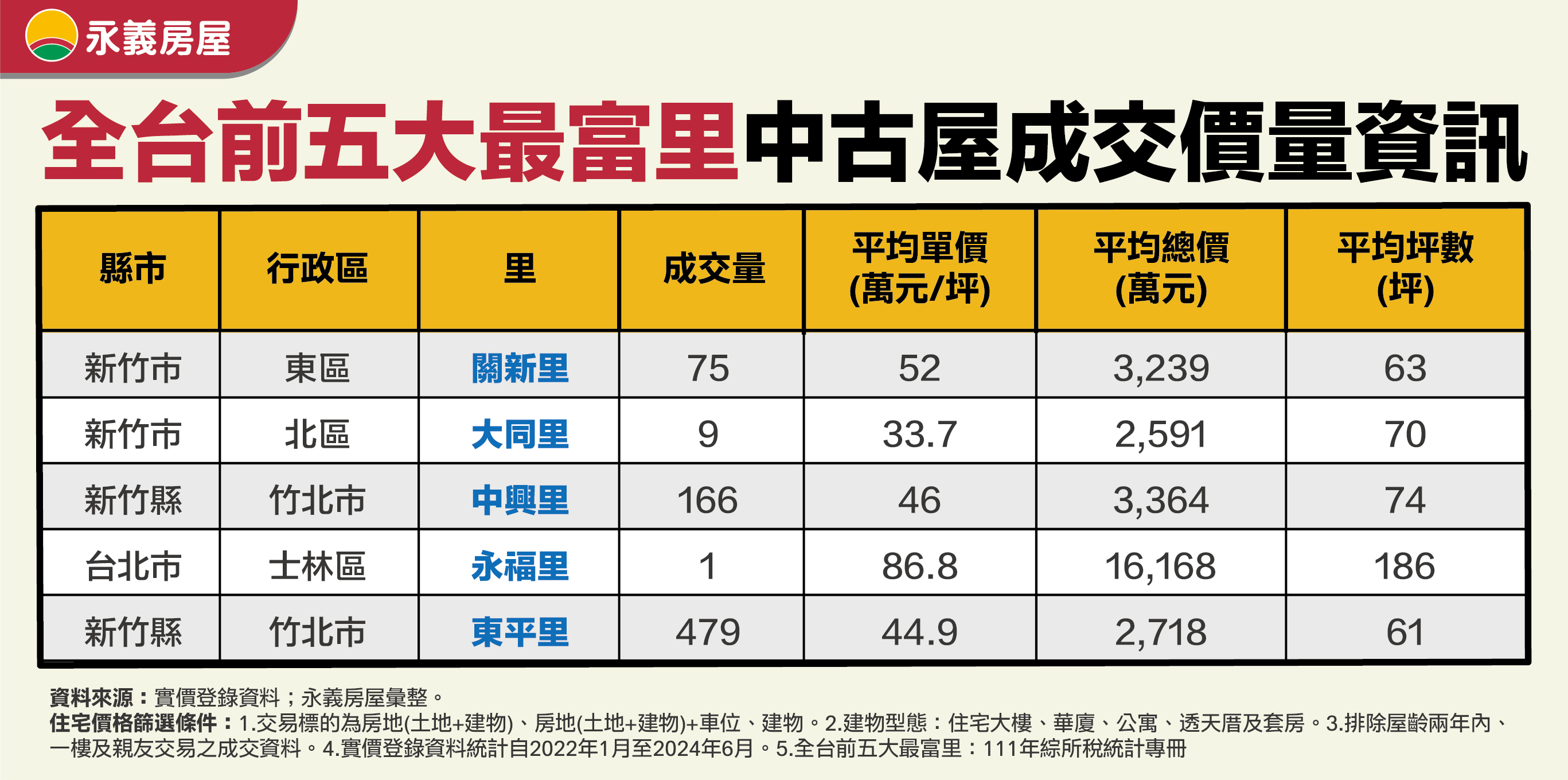 依據財政部發布的最新綜所稅統計專冊顯示,111年度全國最富里前5名,新竹縣、市包辦4名。永義房屋彙整過去兩年半,全台五大最富里房價資訊,除了緊鄰新竹市政府的大同里、台北市故宮旁的永福里交易量過低外,名列前五分別為新竹市「關新里」、新竹縣「中興里」及「東平里」,住戶不僅多與竹科有關,住宅也傾向於高品質社區,高總價、大坪數也成最富里里民喜愛的住宅條件。
